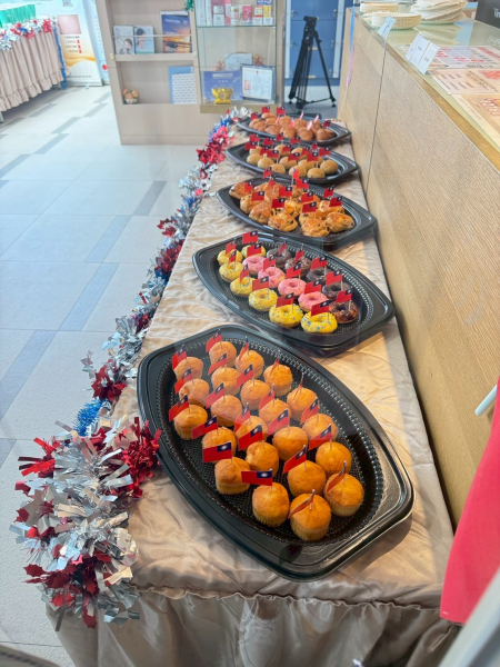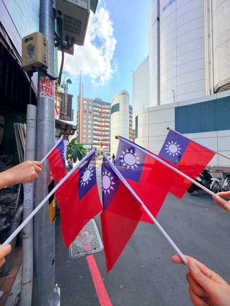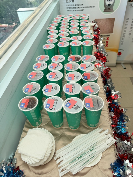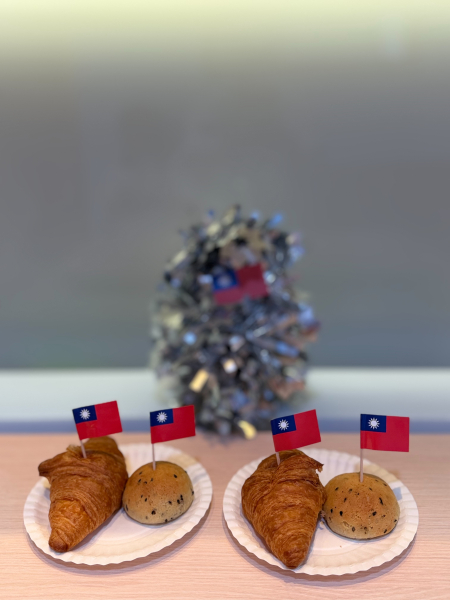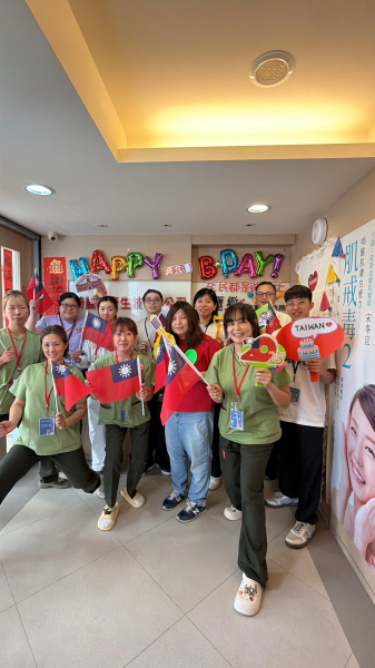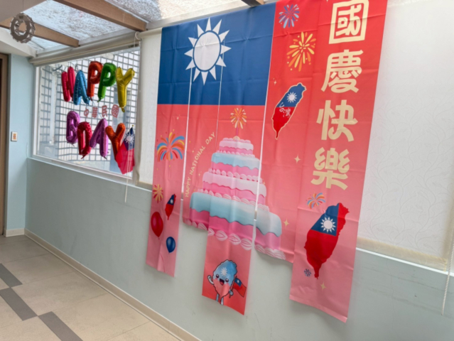 院方特地準備了 114份下午茶,搭配滿滿雙十元素的國旗布置,現場熱鬧非凡。許多民眾更穿戴國旗配件,甚至手拿小國旗,齊聲為台灣送上生日祝福。令人驚喜的是,當天還有外籍學生正好前來參訪,聽聞活動後立刻加入,興奮地和大家一起喊出「Happy Birthday Taiwan!」
