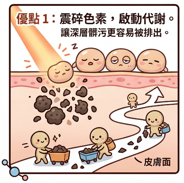 把大石頭打成細碎的小石子;深層的色素團塊(髒東西)被震碎後,體積變小,方便後續搬運處理。